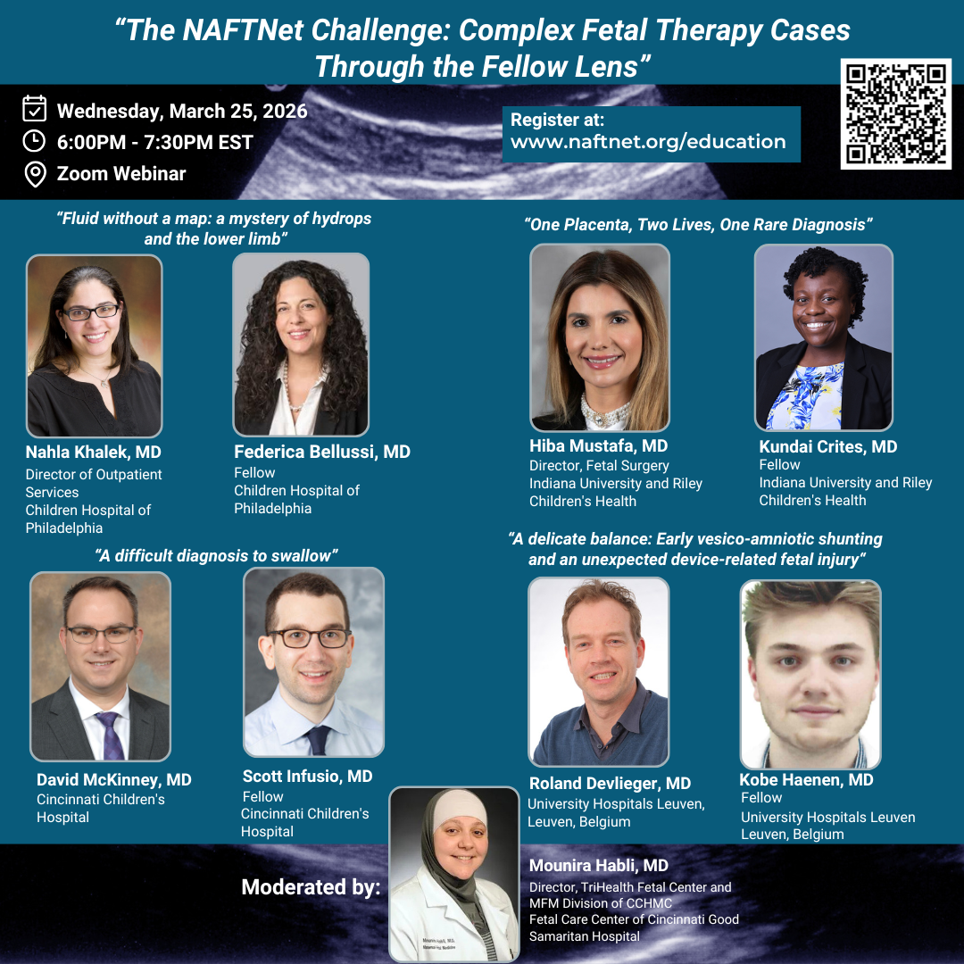 The NAFTNet Challenge: Complex Fetal Therapy Cases Through the Fellow Lens offered an engaging, case‑based exploration of difficult fetal therapy scenarios presented by NAFTNet fellows, highlighting how developing clinicians approach diagnostic uncertainty, interdisciplinary decision‑making, and operative planning in real time. Through detailed case walkthroughs and guided expert commentary, the session showcased the evolving skills of trainees as they synthesized imaging, multidisciplinary input, and evidence‑based practices to manage high‑complexity fetal conditions. The interactive format encouraged discussion of alternative strategies and institutional perspectives, underscoring NAFTNet’s commitment to education, mentorship, and preparing the next generation of leaders in fetal therapy.